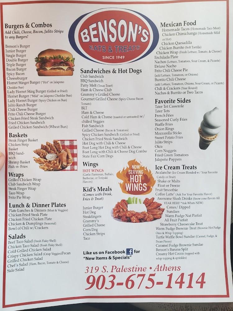 Welcome to Bensons Eats & Treats, your go-to destination for delicious fast food in Athens, TX! Located at 319 S Palestine St, we specialize in mouthwatering burgers, satisfying tacos, and delightful desserts, all served in a relaxed and welcoming atmosphere. Enjoy our outdoor terrace, or opt for convenient dining options like takeout, delivery, and drive-thru. Our menu features tasty items perfect for lunch or dinner, including crispy onion rings and refreshing milkshakes. Family-friendly with accessible amenities, Bensons is ideal for groups and solo diners alike. Join us for a comforting meal that hits the spot every time!